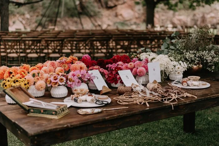 We didn’t choose formal wedding colors, but we wanted to keep things cohesive with the amazing natural setting already offered by our venue. Wood, leather, and copper with warm earth tones and silvery greens seemed to fit the venue’s exposed sandstone formation and surrounding landscape.