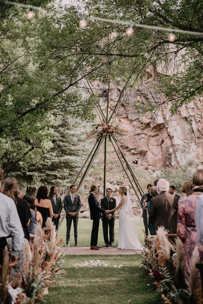 We met while traveling to a winter bouldering area near El Paso. We were camped next to each other for 2 or 3 months, Dustin in a trailer and me in a tipi. To make this story part of our wedding, we used the tipi poles to build a ceremony arch and we brought our travel trailer in to create a guest lounge area.
